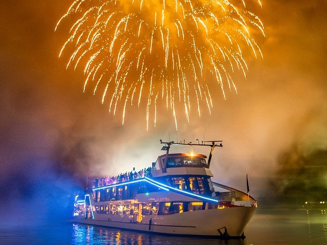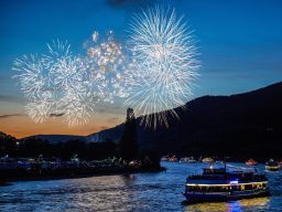 Hauptakttraktion der Reise ist und bleibt das spektakuläre Feuerwerk. Am späten Nachmittag/frühen Abend legt unser Schiff von Rüdesheim ab. Wir fahren an zahlreichen Burgen vorbei in das sagenumwobene Obere Mittelrheintal in Richtung Loreleyfelsen. Am Zielpunkt angekommen dreht unser Schiff um und wir fahren im Schiffskonvoi vorbei an prächtigen Feuerwerken mit imposanten Donnerhall. Rhein in Flammen endet mit einem großen Finalfeuerwerk bei Rüdesheim.